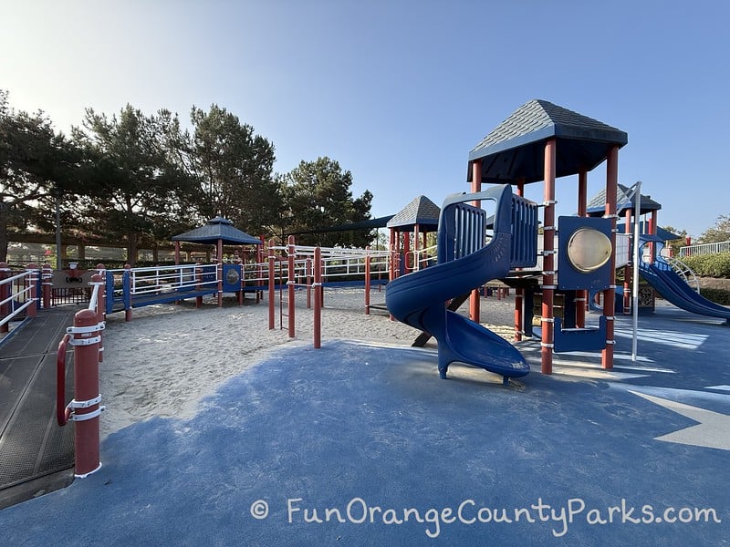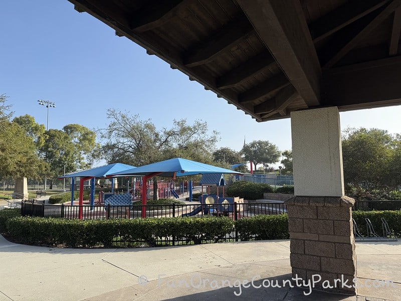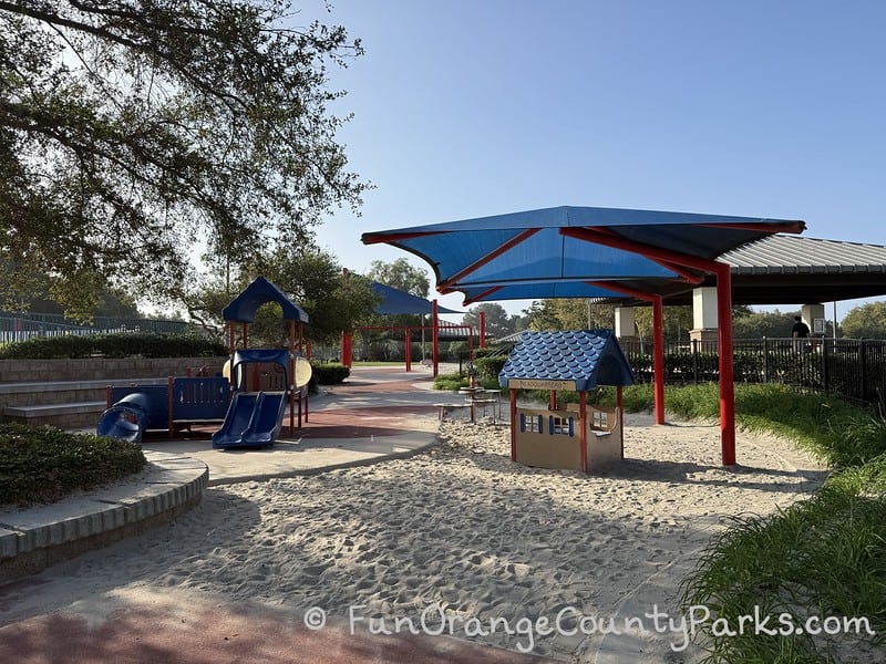 - Play area is somewhat sunken - so it can be hot - but picnic gazebos, shade covers, and garden provide shade relief