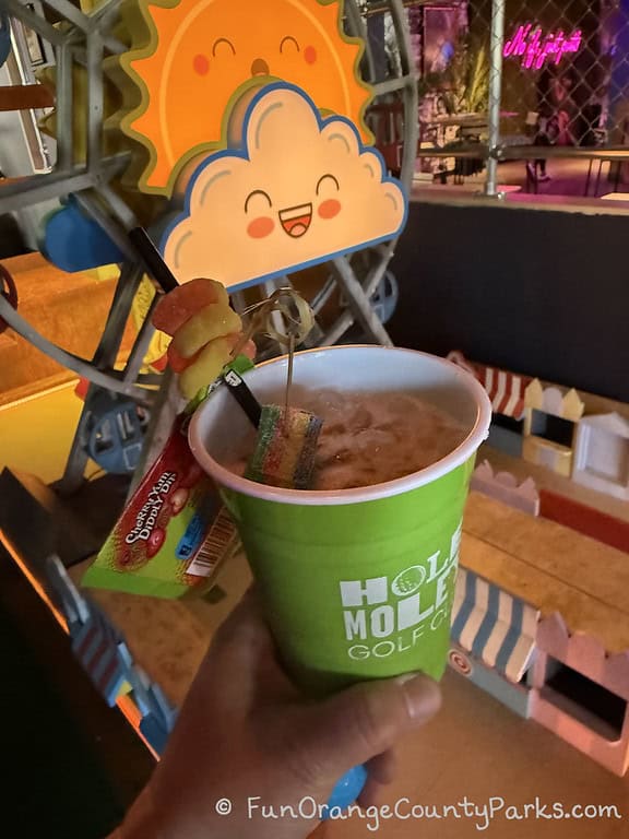 There is no outside food or drink allowed. Also, no eating on the golf course or in the challenge rooms. We were able to bring our drinks around as we played the holes, though.
