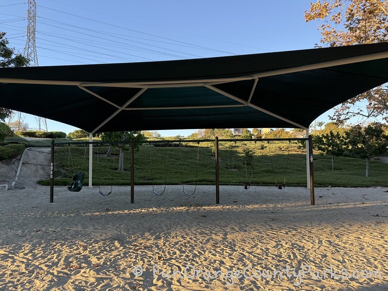 Ridgecrest Park in Aliso Viejo is a favorite for families because of all the play options. Shade covers over the playground make it a nice option for summer and hot days.